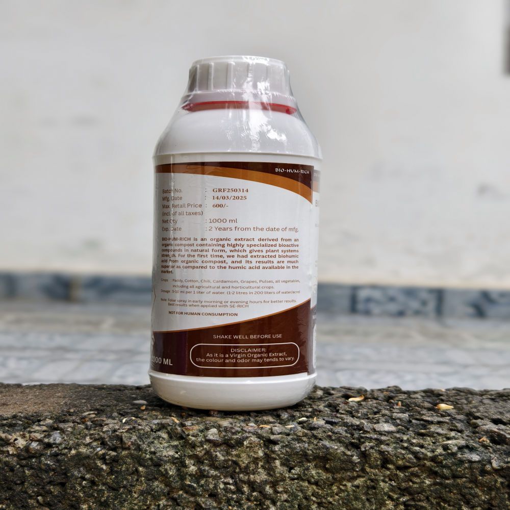 Bio-Hum-Rich is a compost-based humic acid that helps plants grow strong roots and use nutrients better. It works in the soil to support plant strength, help crops stay firm during stress, and keep soil life active without chemicals.