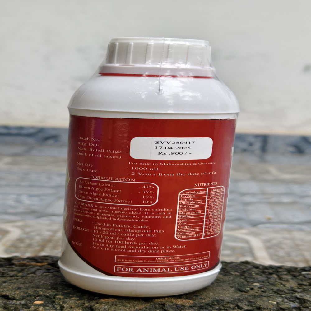 Vepmaxx is a marine algae feed supplement for dairy cows, buffaloes, and livestock. It supports milk yield, digestion, fertility, and immunity. Natural minerals and trace elements make animals healthier and stronger. It also helps reduce methane emissions for a cleaner, safer farm.